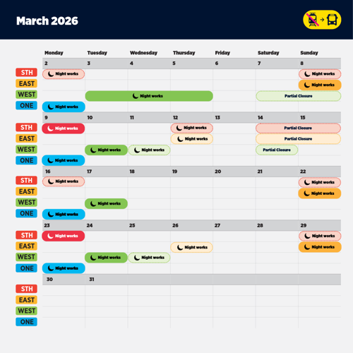 Eastern Line: Partial closure between Ōtāhuhu and Waitematā from 28 February to 1 March 2026.Partial closure between Waitematā to Ōtāhuhu with Ōtāhuhu to Manukau being served by the Southern Line from 14 to 15 March 2026.