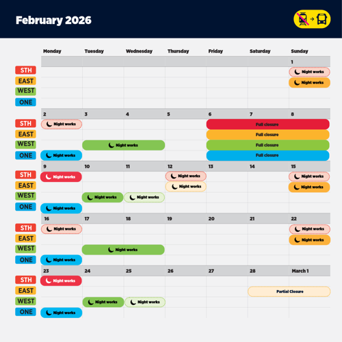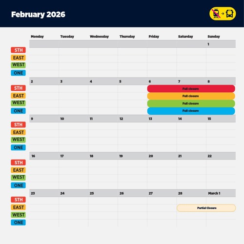 Eastern Line: Full closure from 6 to 8 February 2026. Partial closure between Otahuhu and Waitemata from 28 February to 1 March 2026.