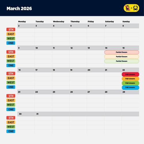 Eastern Line: Full closure from 28 February to 1 March 2026. Partial closure between Waitemata to Otahuhu with Otahuhu to Manukau being served by the Southern Line from 14 to 15 March 2026.Full closure on 22 March 2026.