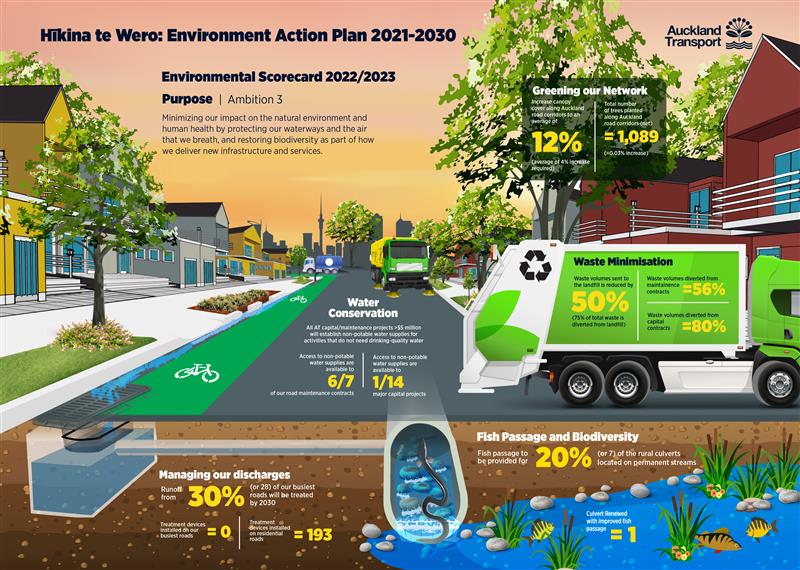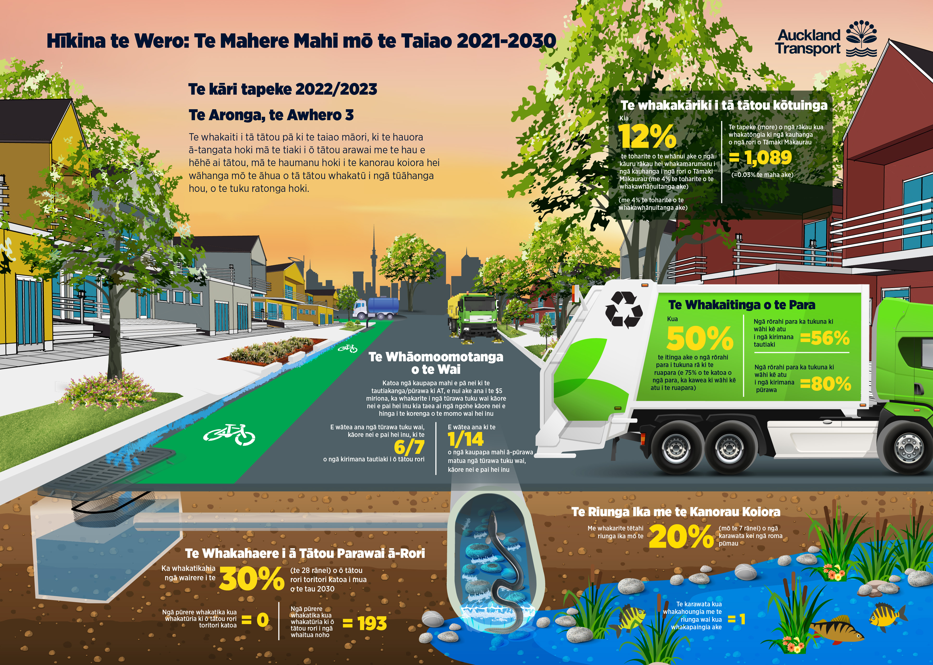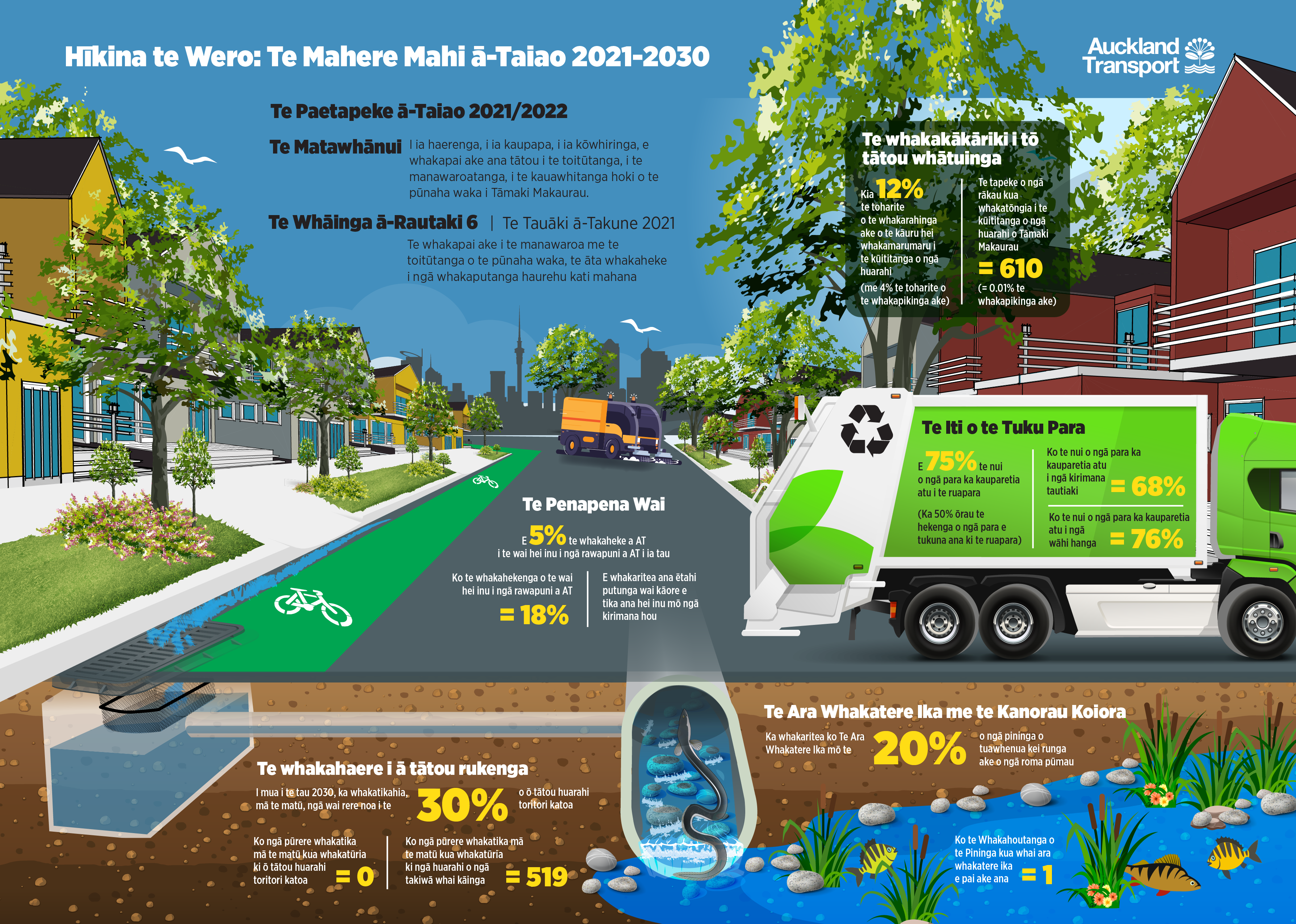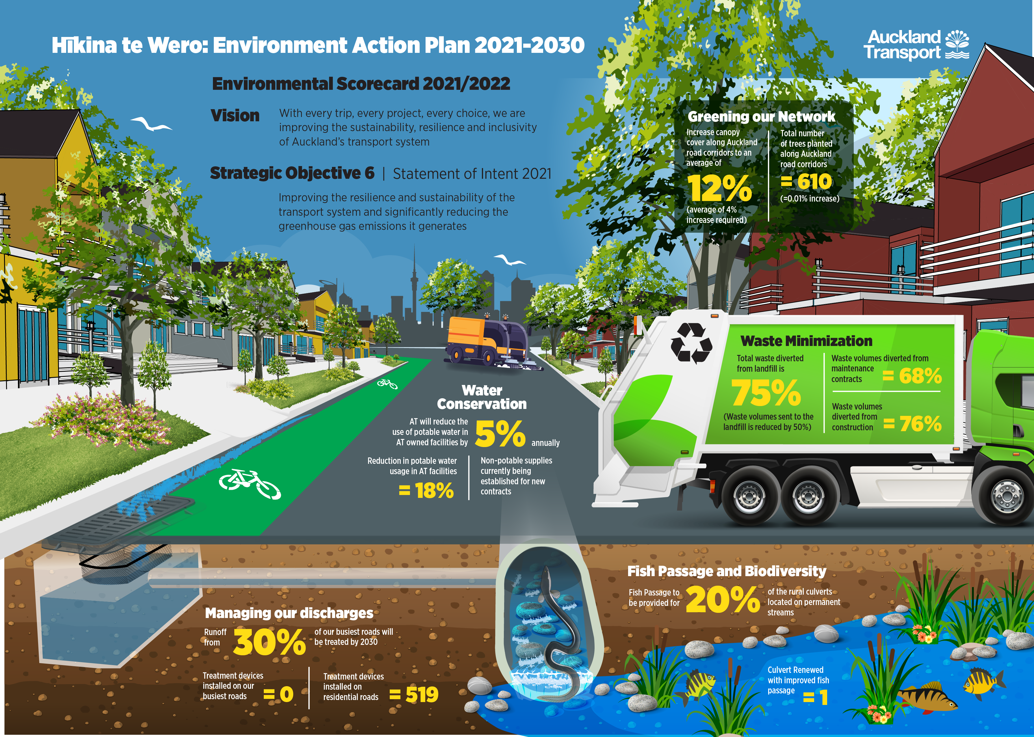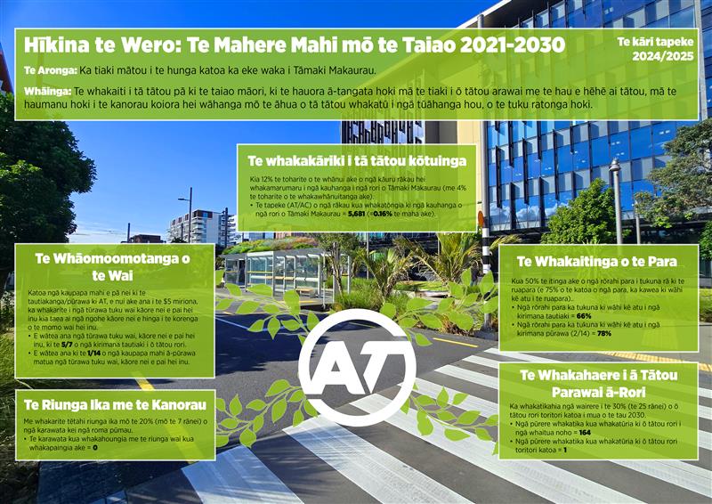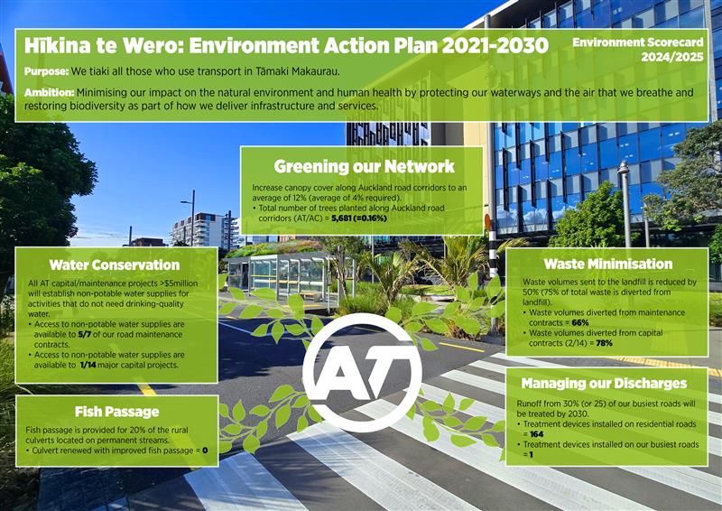 AT has developed the Hīkina te Wero Environmental Action Plan to monitor and report on progress towards 5 key environmental targets over 10 years: