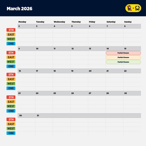 Eastern Line: Full closure from 28 February to 1 March 2026. Partial closure between Waitemata to Otahuhu with Otahuhu to Manukau being served by the Southern Line from 14 to 15 March 2026.