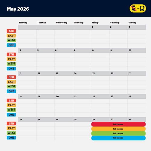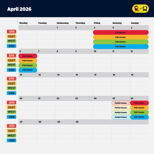 Western Line: Full closure from 3 to 6 April 2026. Partial closure on 25 April, with trains only running until 2pm then full closure on Western Line. Full closure 26 April 2026.