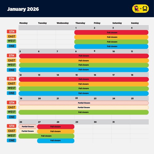 All lines: Full network closure from Saturday 27 December 2025 to Sunday 18 January 2026. Some services resume between 19 January to 26 January 2026. Full closure 27 – 28 January 2026.
