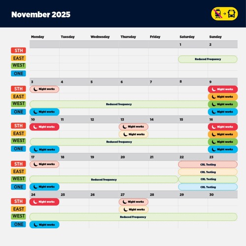 Western Line: Partial closure between Swanson and Henderson, and a reduced frequency from Tuesday 28 October to Friday 26 December. Full closures for nightworks will be in place from 9:30pm every Tuesday and Wednesday this month, as well as on Thursday 6, Thursday 13 and Thursday 20 November.