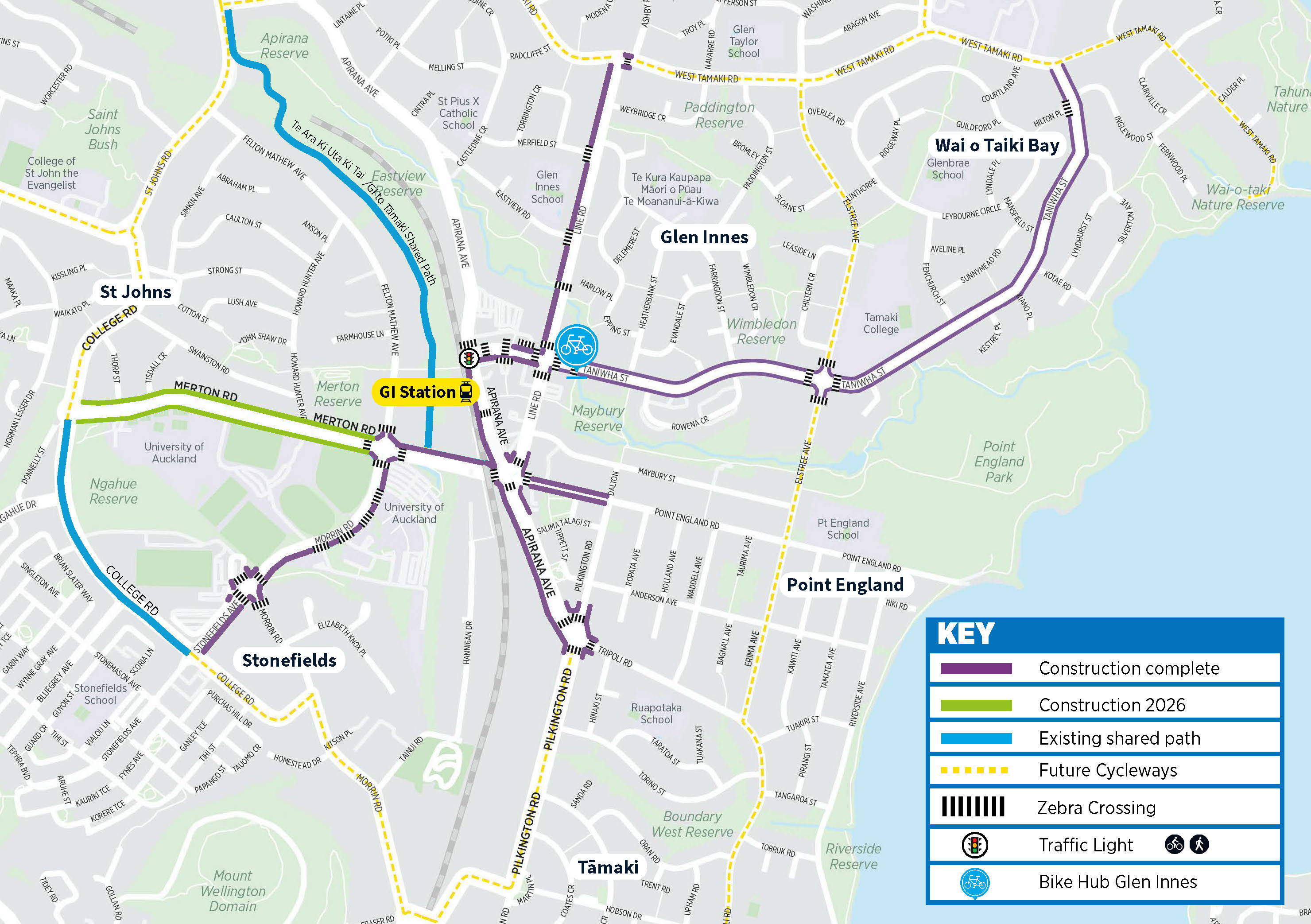 The section of cycleway on Merton Road, between College Road and Morrin Road, is the last 5% of the Links to Glen Innes project.
