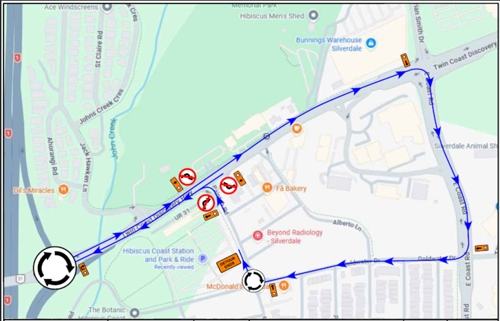 Alberto Lane Road will be closed for 3 nights between 10 May and 21 May from 8pm to 5am for traffic island changes.