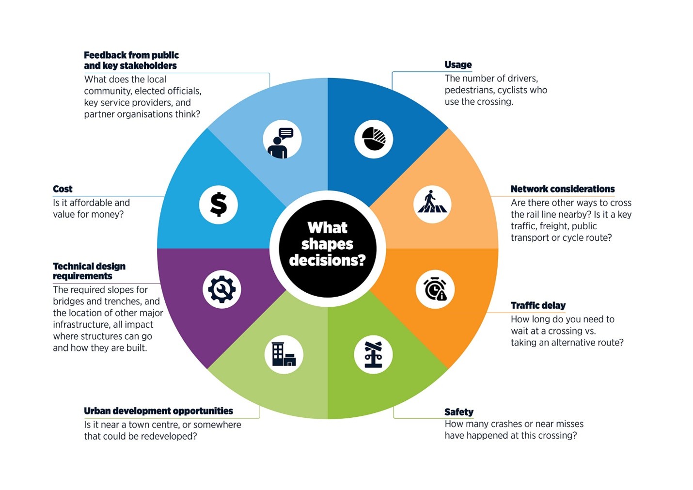 The staging of the 10-to-30-year programme to remove all level crossings and provide safer new connections is influenced by factors like availability of funding, the number of trains on different parts of the rail network and patronage growth.