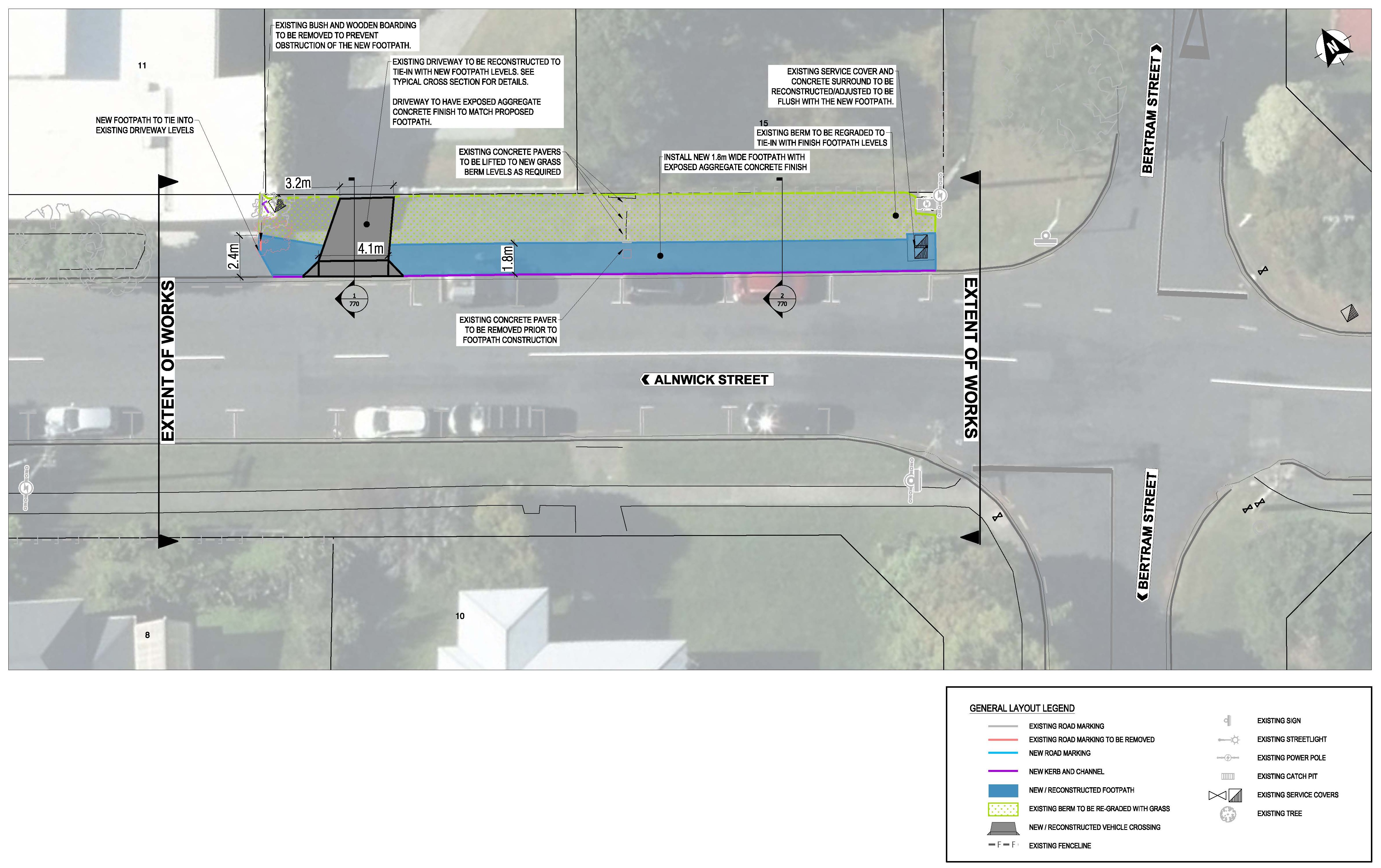 To minimize the impact to the community during construction, we are planning to install a new footpath on Alnwick Street while working on the bus stops. The footpath will run between the medical centre driveway at 11 Alnwick Street and the end of the street parking near the Bertram Street intersection. This footpath will connect to 13A, 13B and 15 Alnwick Street.