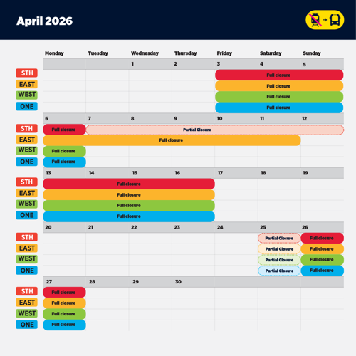 Eastern Line: Full closure from 3 to 11 April 2026. Full closure on 13 to 16 April 2026. Partial closure on 25 April, with trains only running until 2pm then full closure on Eastern Line. Full closure 26 to 27 April 2026.