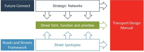 This guidance directs a project to deliver key outcomes aligned with the Transport Design Manual. These relationships are illustrated in the following figure.